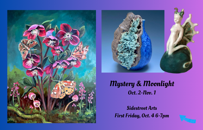 Sidestreet Arts is having a featured show called: Mystery & Moonlight, featuring artists Dawn Panttaja, Jaclyn Evalds and Ha Austin. Join our First Friday opening Oct. 4, 5-7pm, and meet these fantastic artists and hear them talk about their fairy inspired, and moonlit garden themed artworks. Don’t be a dewey toad sitting on a log, and meet us there!