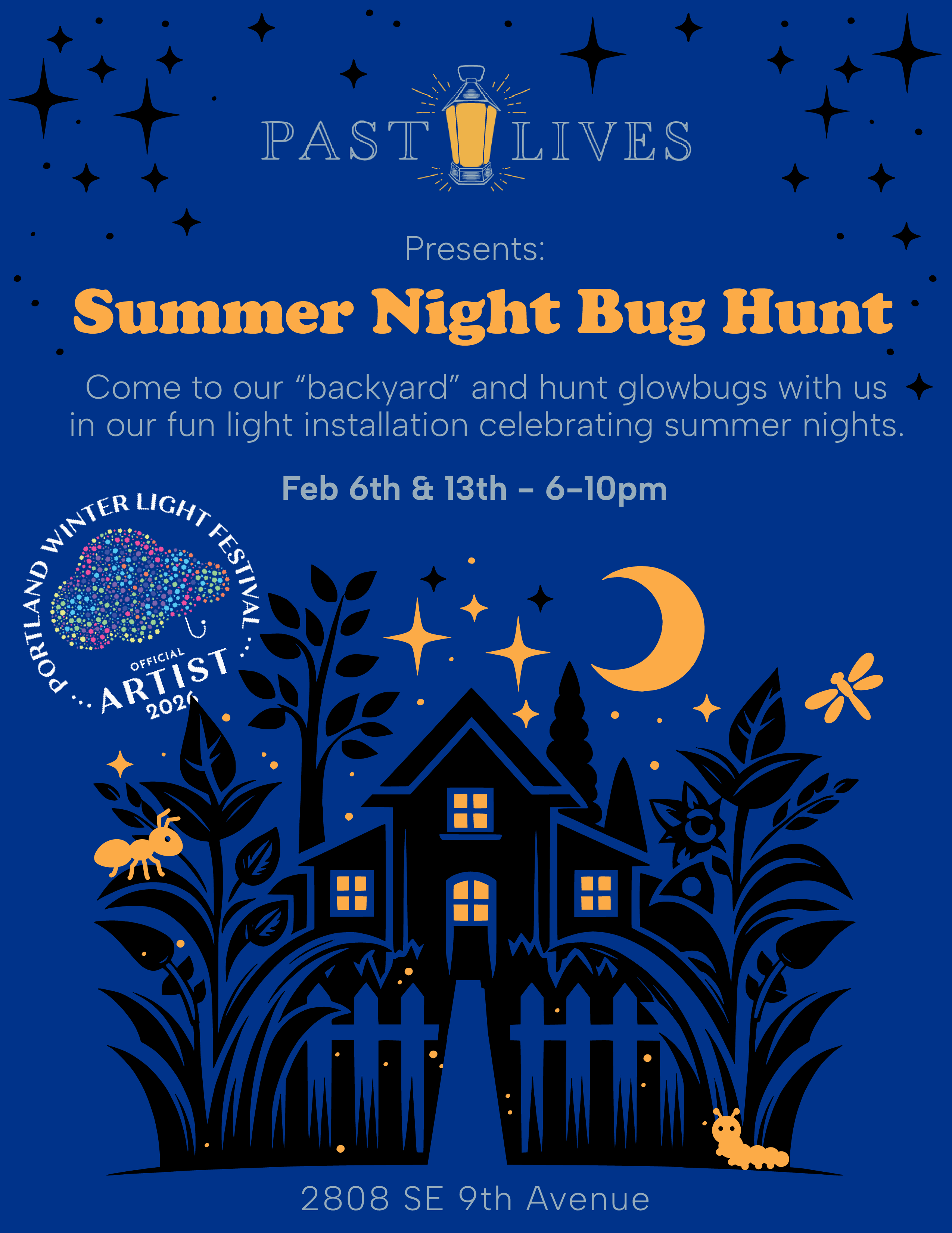 Past Lives is holding a summer night bug hunt for the Winter Lights Festival. Come hunt glow bugs in our “Backyard” and enjoy some art and creative company.