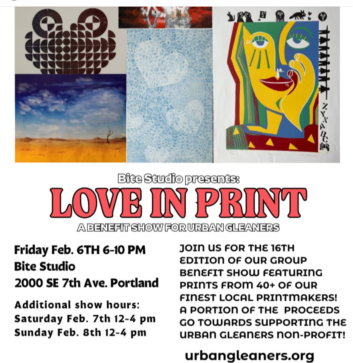We have a big show coming up Feb. 6th at Bite Studio! It’s our ever popular benefit show Love in Print! This year proceeds go to @urbangleanerspdx!