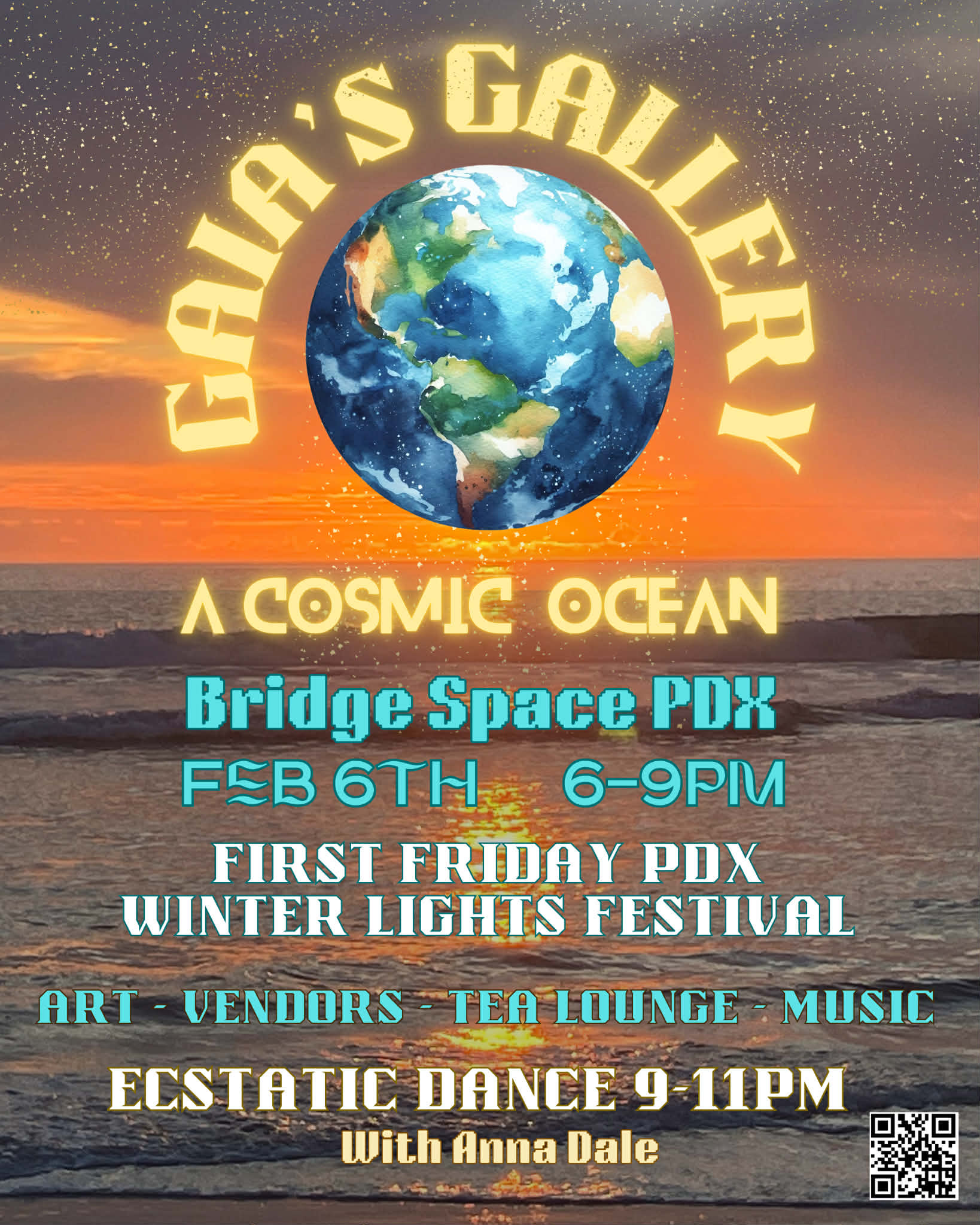 Come on out to A Winter Light Festival edition of Gaia’s Gallery: A Cosmic Ocean, on Friday Feb 6th! In similar fashion to our last two awesome events, we will have live music, First Friday Art Walk, local craft vendors, artists, tea lounge to discuss the future, and most importantly Ecstatic Dance after 9pm to top it off. We will also have light installations and a total transformation of the space into a cosmic ocean, as above so below! Starry skies meet the infinite ocean, a place to reconnect with the Oneness of all.